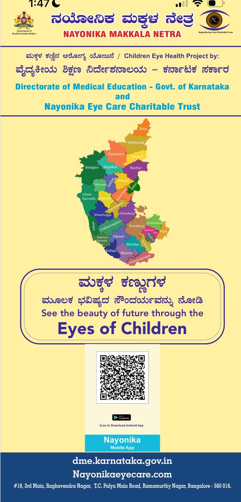Mobile App been designed for creating Mass Eye Healh Awareness and Referral of Children with Eye Problems by Teachers to 24 Medical colleges for the best EYE Health Treatment FREE OF COST across entire state in Goal of AVOIDABLE BLINDNESS FREE Karnataka state for Children.